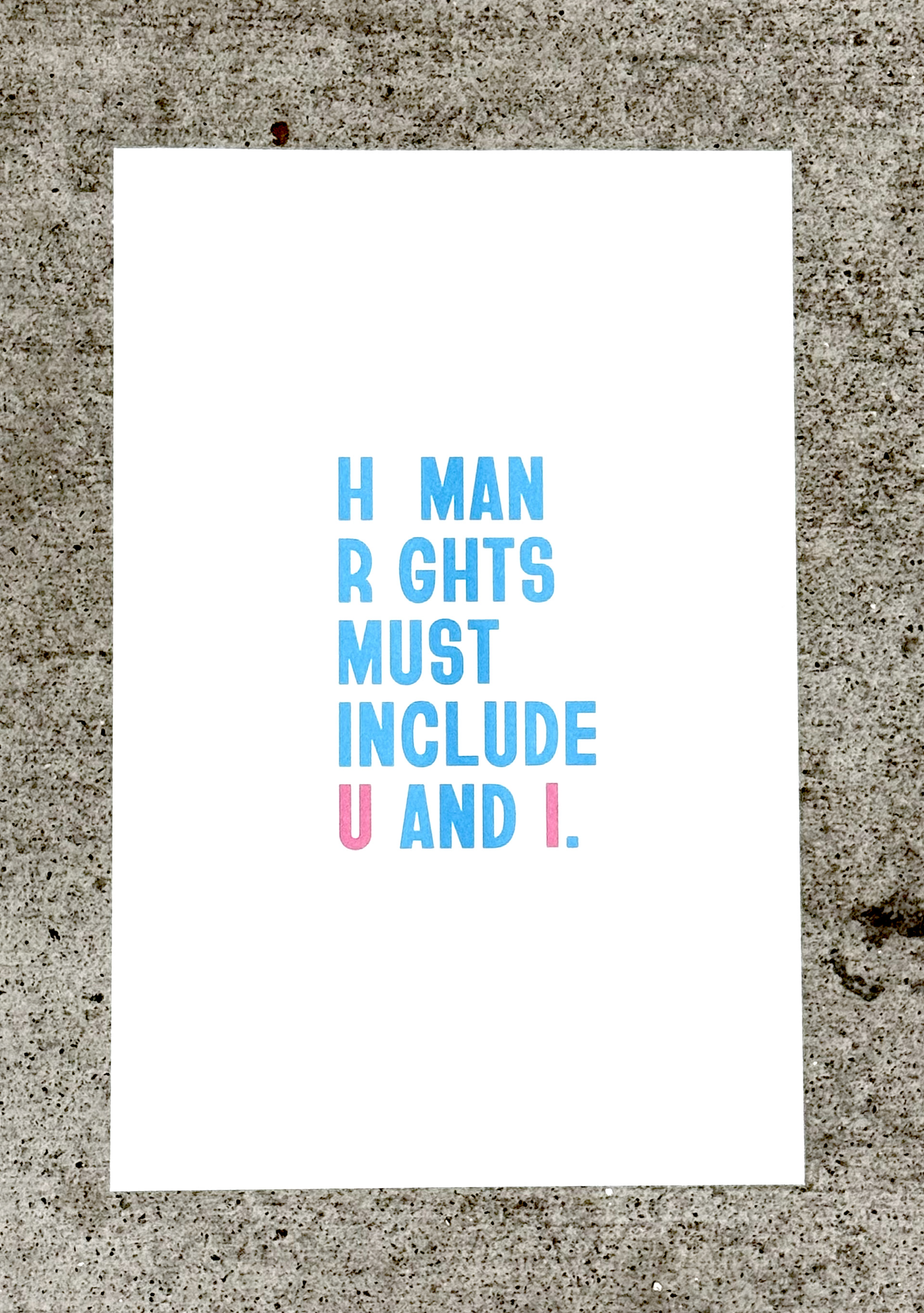 This project uses print as a tool for visibility and collective affirmation. Its format supports wide distribution and shared ownership, allowing the message to circulate safely and consistently, including in contexts where anonymity is necessary. The work insists that human rights frameworks must actively include trans people rather than treating inclusion as implicit or symbolic.