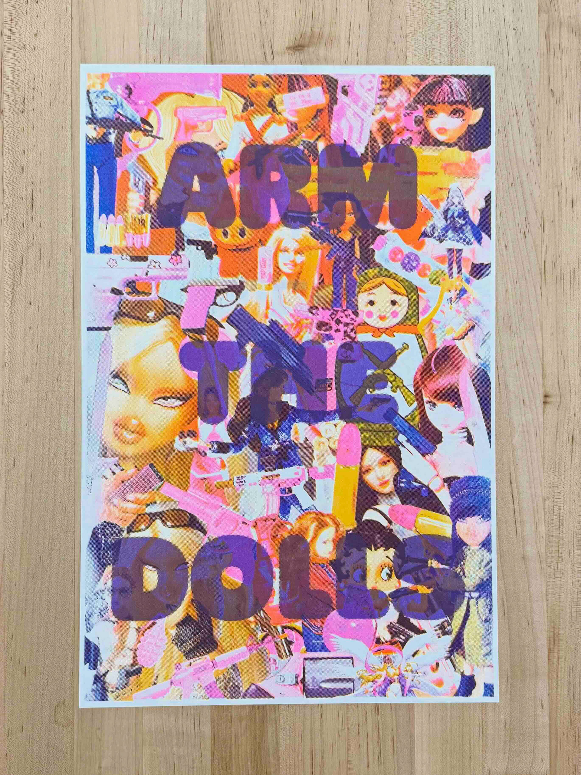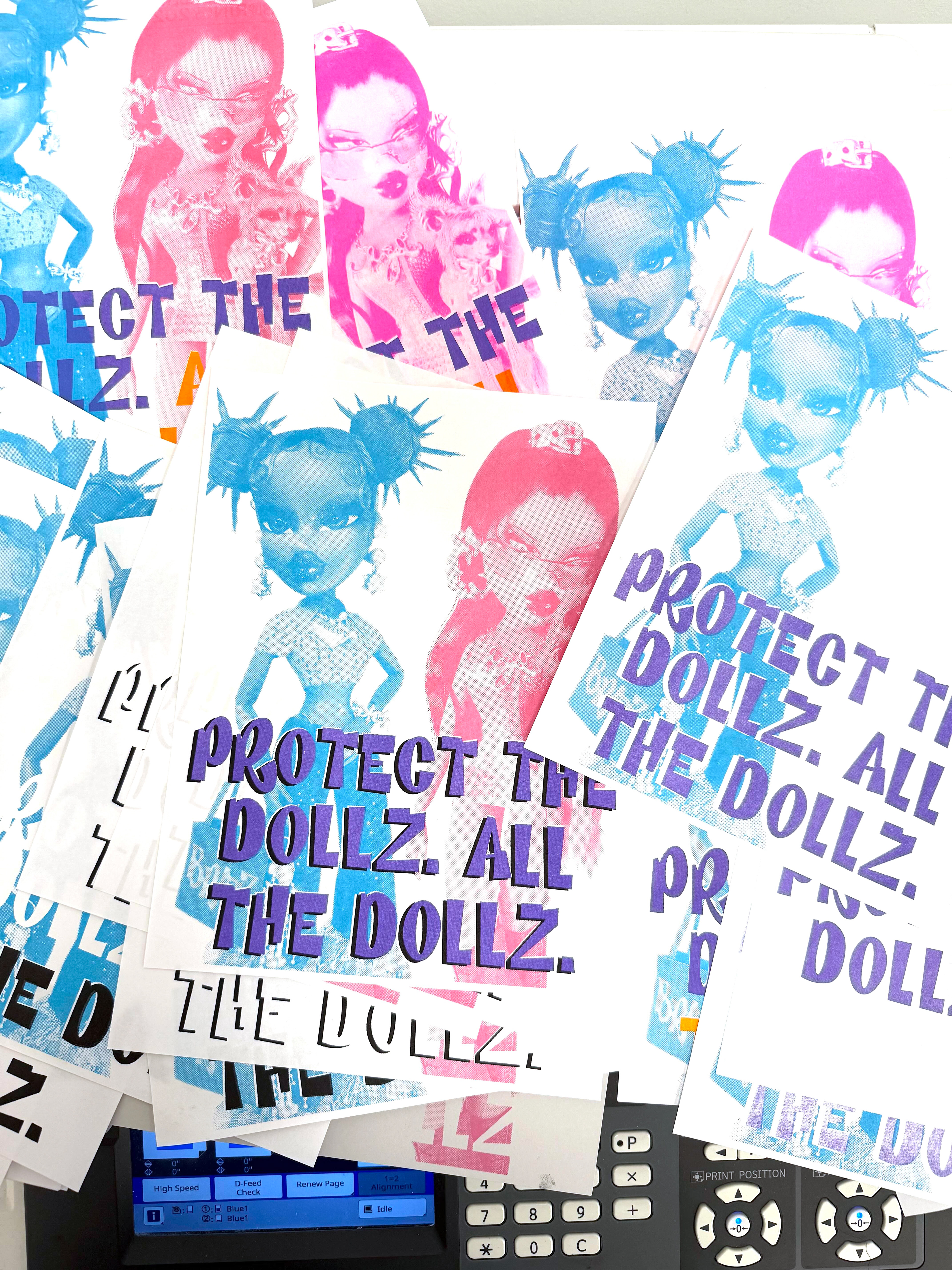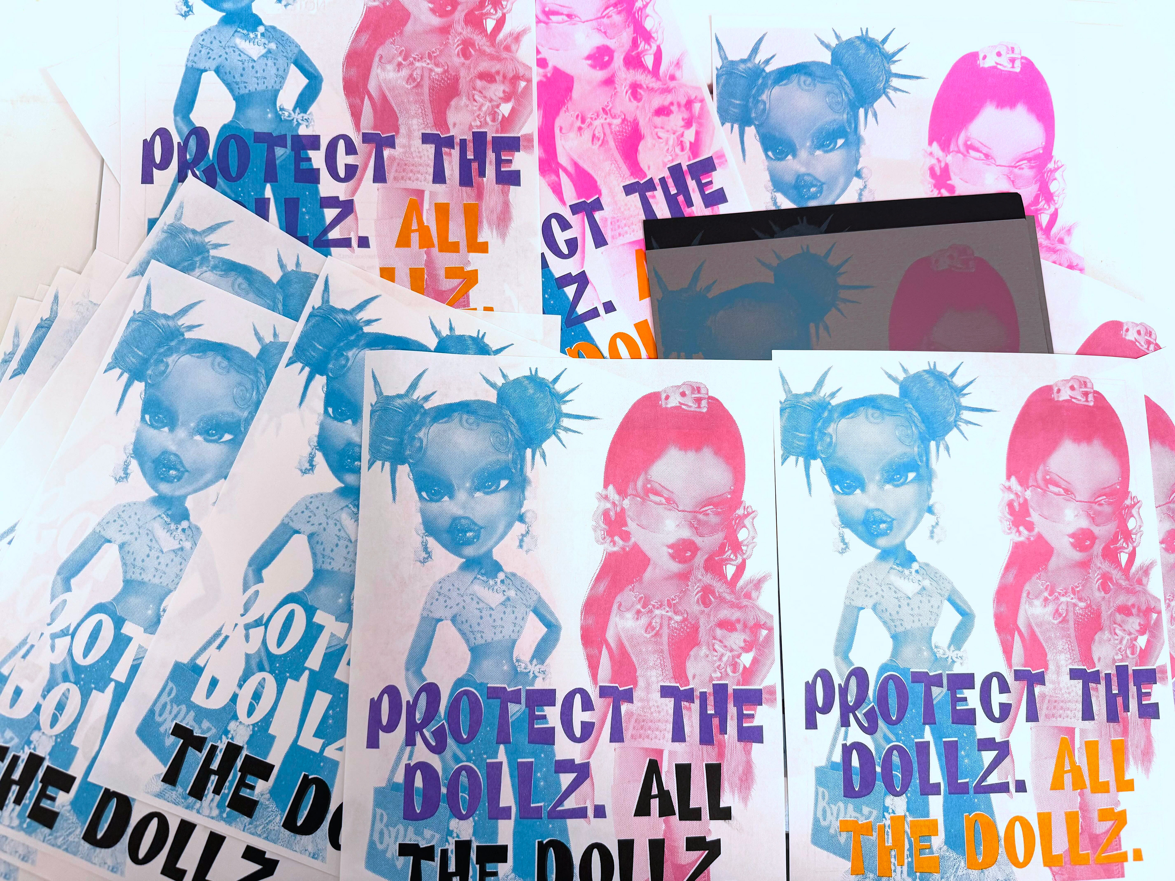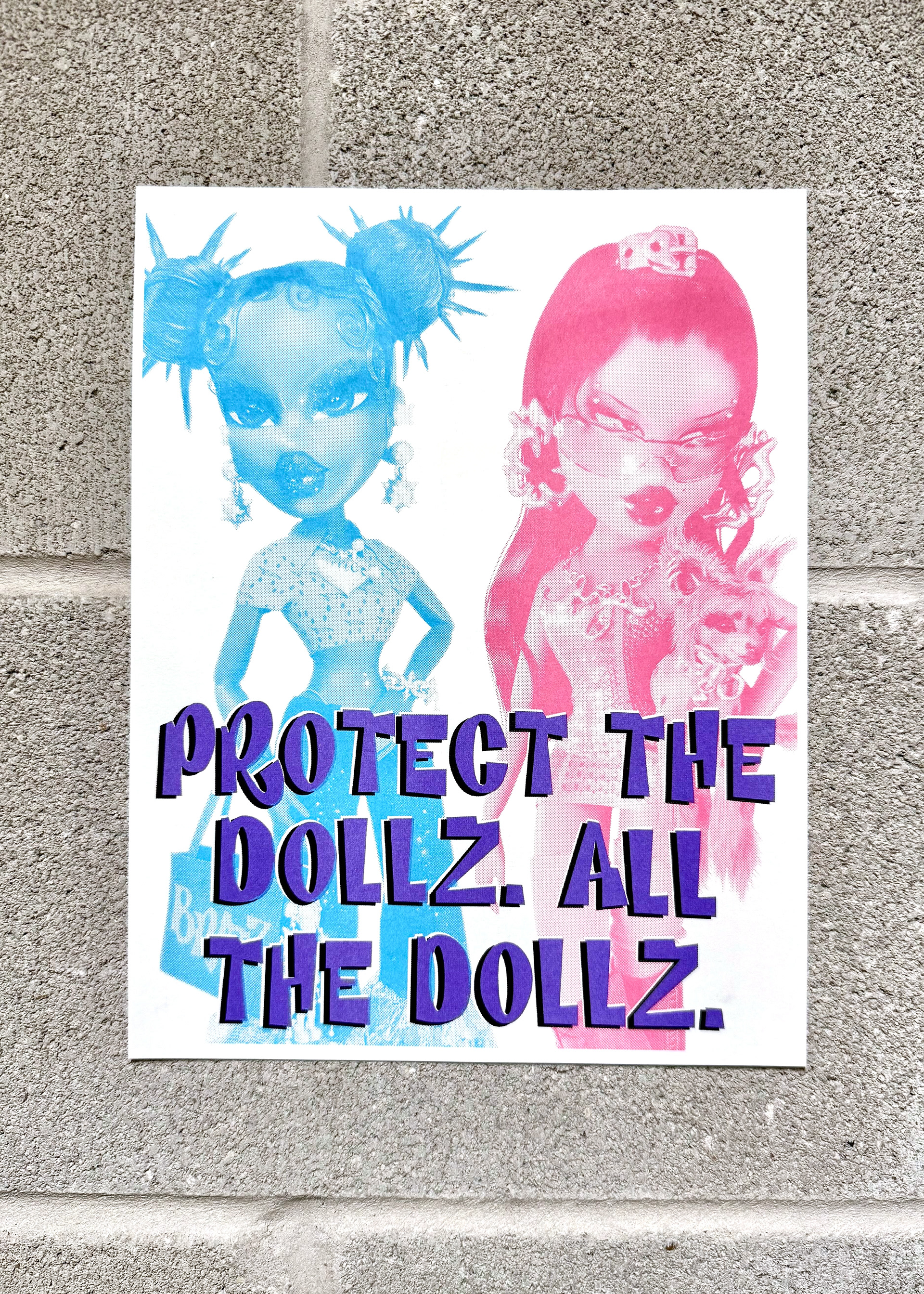 Protect the Dollz. All the Dollz. is a protest risograph print that uses pop culture imagery and direct language to address protection, vulnerability, and solidarity. By reclaiming the figure of the doll, the work draws attention to bodies that are often infantilized, policed, or denied protection, while insisting on care and defense for all, especially those most marginalized.